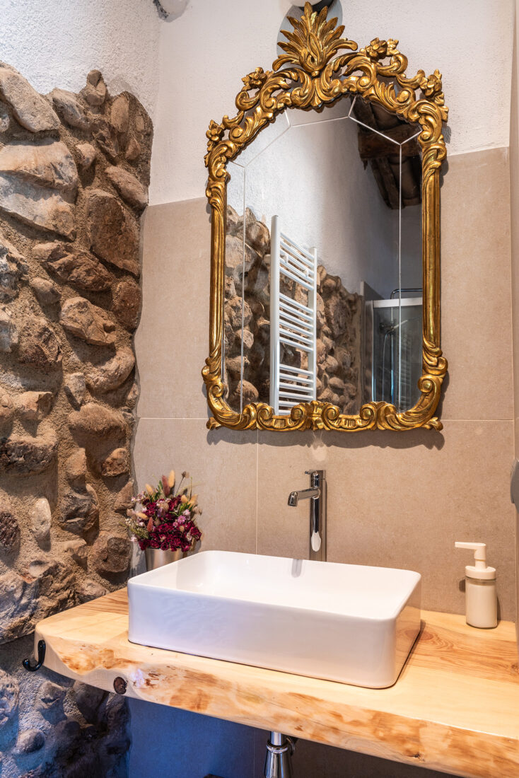 Handpicked materials, a sculpted basin, and an ornate golden mirror turn even the bathroom into a small sanctuary, reflecting the care, intimacy, and beauty woven into every corner of the house.